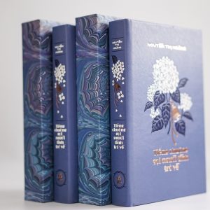 – Bìa sách được làm từ da PU, màu xanh ánh tím, bồi trên carton 3 ly.